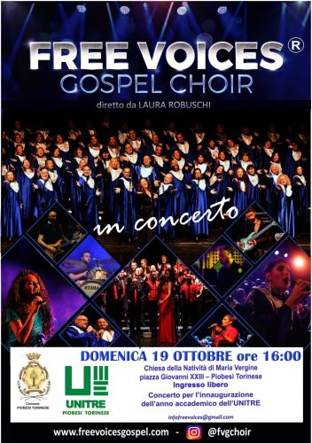 Il 19 ottobre 2025 alle ore 16 presso la Chiesa della Natività di Maria Vergine, piazza Giovanni XXIII, Piobesi Torinese ascolteremo i FREE VOICES GOSPEL CHOIR in concerto diretti da Laura Robuschi.